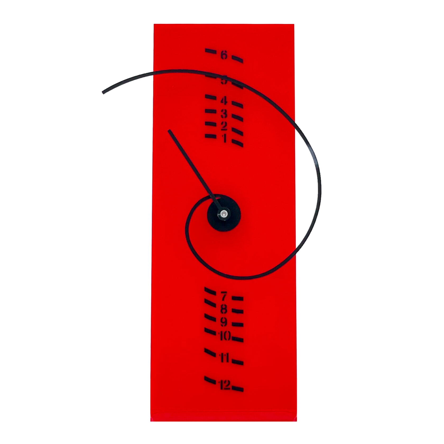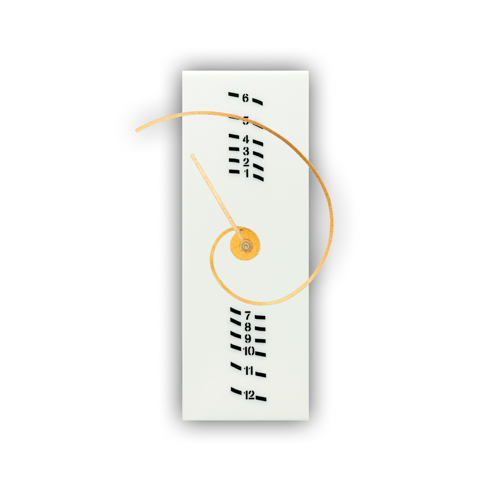 Годинник створений за принципом легендарного "золотого перетину" має 2 стрілки, які обертаються навколо своєї осі! Велика годинна стрілка у формі спіралі, та мала хвилинна. Орієнтуючись за їх положенням Ви з легкістю зможете визначити час! Для розуміння хвилинної стрілки потрібно умовно поділити циферблат, якщо вона направлена рівно в гору, то це означає 0 хвилин, якщо стрілка під кутом в 90° дивиться вправо, то 15 хв, відповідно якщо її нахил 45° праворуч від 0 хв, то означає що час 7,5 хв! З годинниковою стрілкою ще легше! Якщо відрізок спіралі перетинає позначку на циферблаті(не можливо щоб було 2 перетини) рівно з нею, а хвилинна направлена у гору, то це рівна година(7:00 або 16:00 в залежності від положення)! Відповідно якщо спіраль знаходиться рівновіддалено між 2 позначками, то хвилинна стрілка буде дивитися донизу(8:30 або 4:30 в залежності від положення)