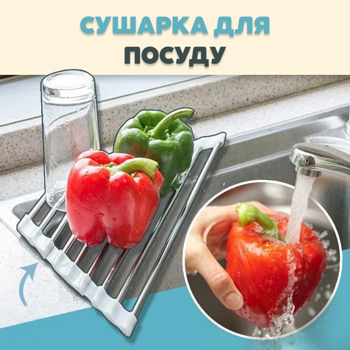 Сушарка для посуду встановлюється на мийку. Вона дозволяє зберігати посуд сухим і завжди під рукою. Виріб виконаний у вигляді грат з хромованим покриттям, що запобігає утворенню корозії.